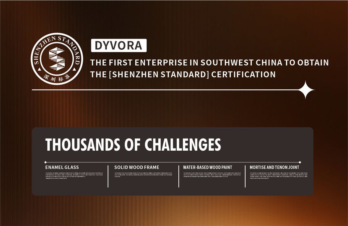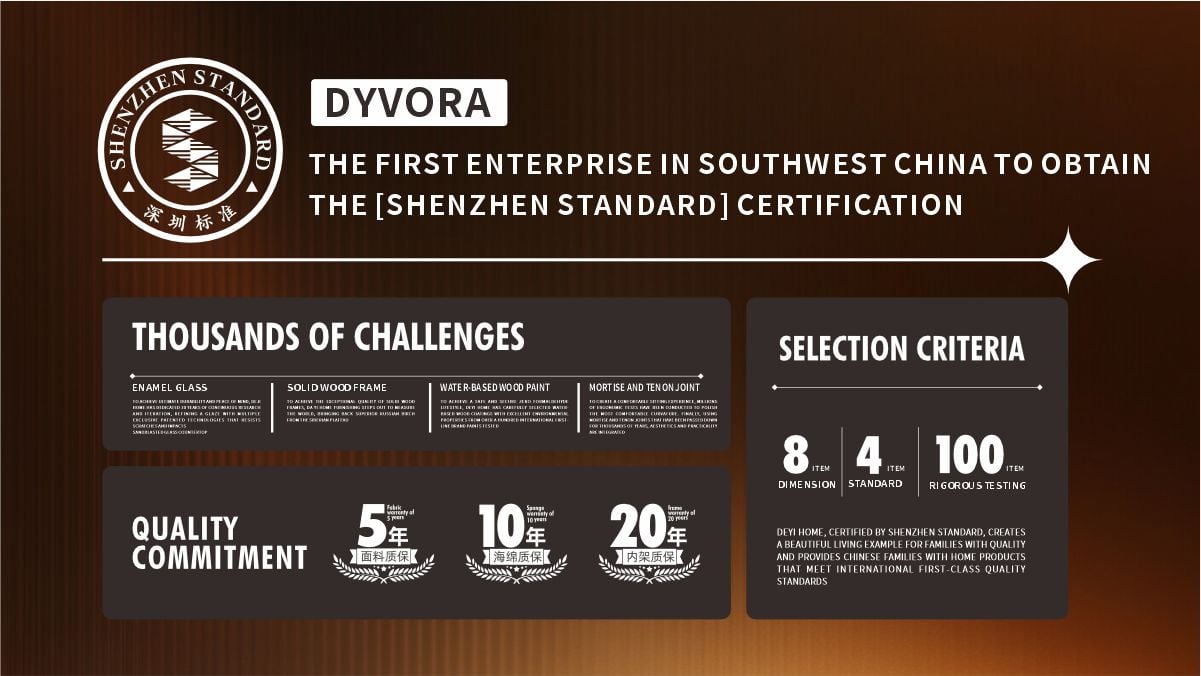 In 2022, DYVORA became the first enterprise in Southwest China to pass the certification for dining tables, sofas, and mattresses simultaneously. To achieve this "gold standard", our products underwent comprehensive evaluations across 8 dimensions, 4 distinct standards, and 100 rigorous tests.